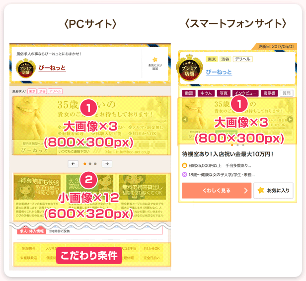 店舗一覧と詳細のそれぞれのページに対応する①大画像が各3枚づつ登録可能。さらに②小画像が12枚登録可能!店舗詳細では③求人注目ポイントが掲載できますので、豊富な画像で多くの情報を伝える事ができます。